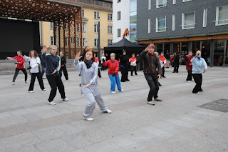 Lauantaina olimme Rotuaarilla, missä meille oli varattuna esiintymislava ja aukio klo 11-14. Lisäksi paikalla oli esittelyteltta, josta jaoimme tietoa ja lehtisiä. Pidimme erilaisilla kokoonpanoilla useita näytöksiä, erityisesti mieleen jäi ryhmä 24-näytös aukiolla Shifun johtamana, johon kaikki osallistuivat! Oli siinä oululaisilla ihmettelemistä! Rotuaarin harjoitusten jälkeen siirryimme Ruotsalaiselle koululle, missä treenaus jatkui Ba duan jin:in syventävällä opetuksella.
